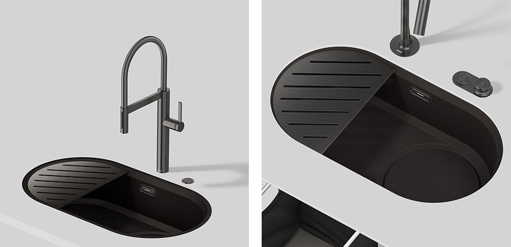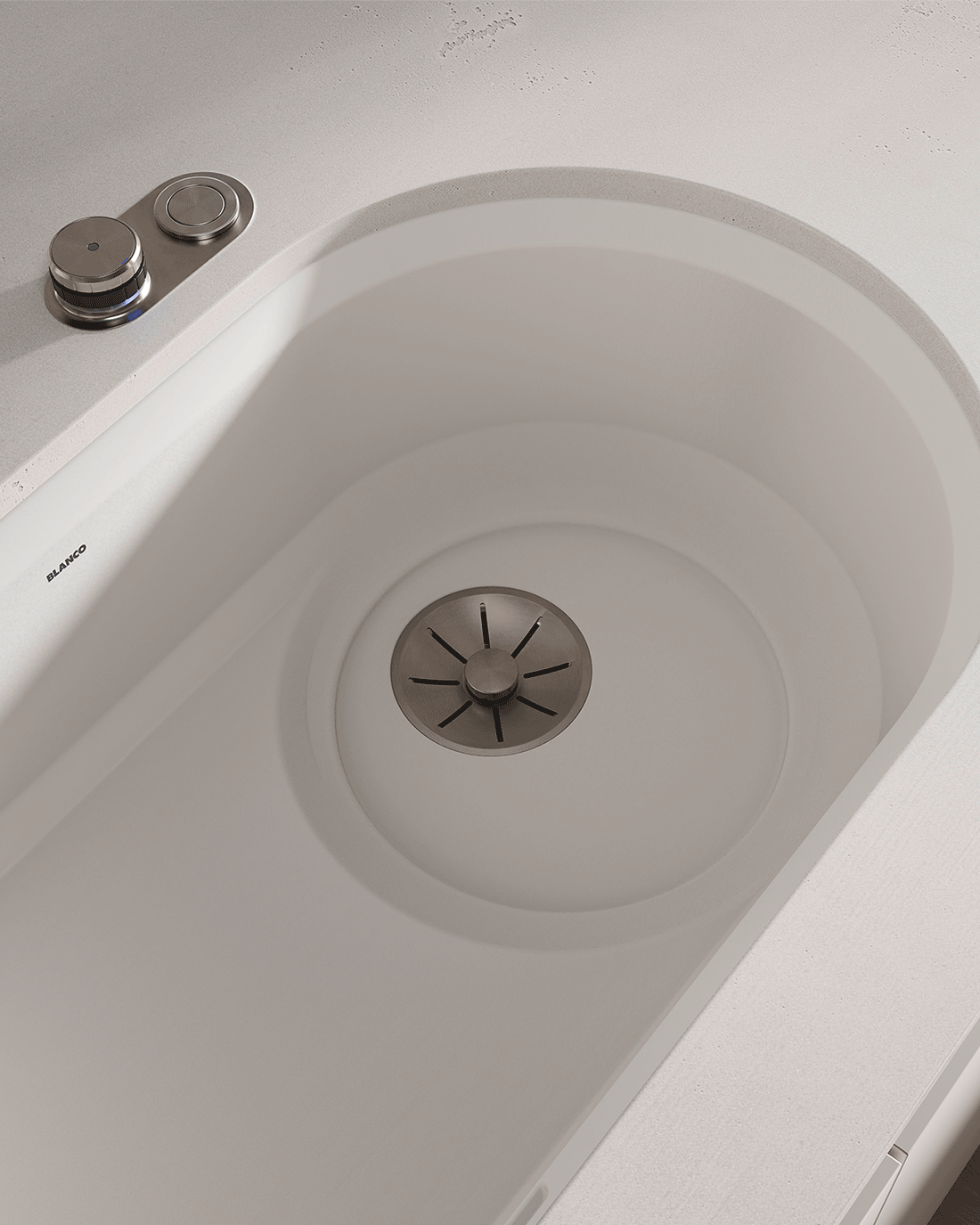 Løsningen er tenkt som en naturlig forlengelse av vasken, der alle elementer spiller sammen og skaper en helhetlig og gjennomført arbeidsflate. Avrenningsristen legges sømløst over vasken og utvider arbeidsområdet uten å bryte med designet. Den gir praktisk fleksibilitet i hverdagen, enten det gjelder oppvask eller tilberedning av mat. Med Reco push control styres avløpet enkelt med et lett trykk, og den eksklusive kurvventilen bidrar til et mer raffinert uttrykk.