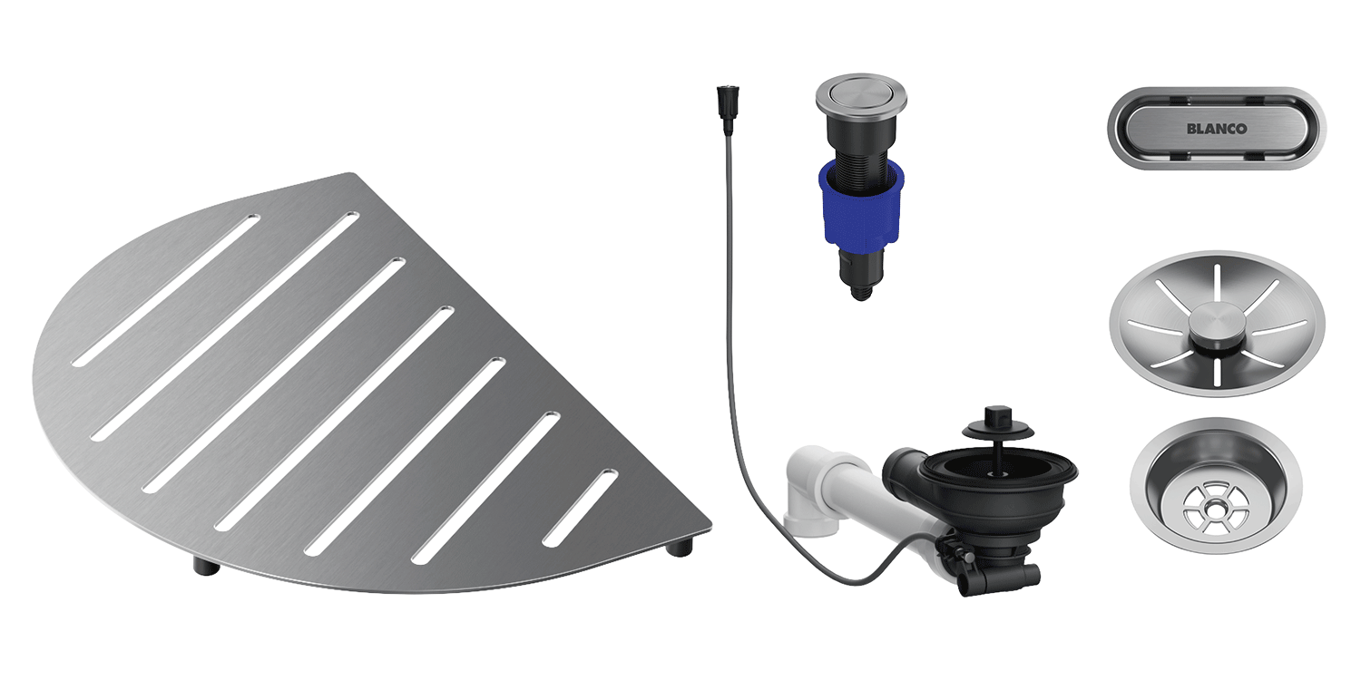 Tilbehørspakken leveres i flere utførelser, slik at de enkelt kan harmonere med både blandebatterier og øvrige kjøkkenelementer.