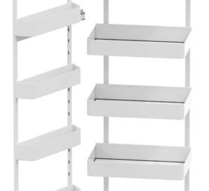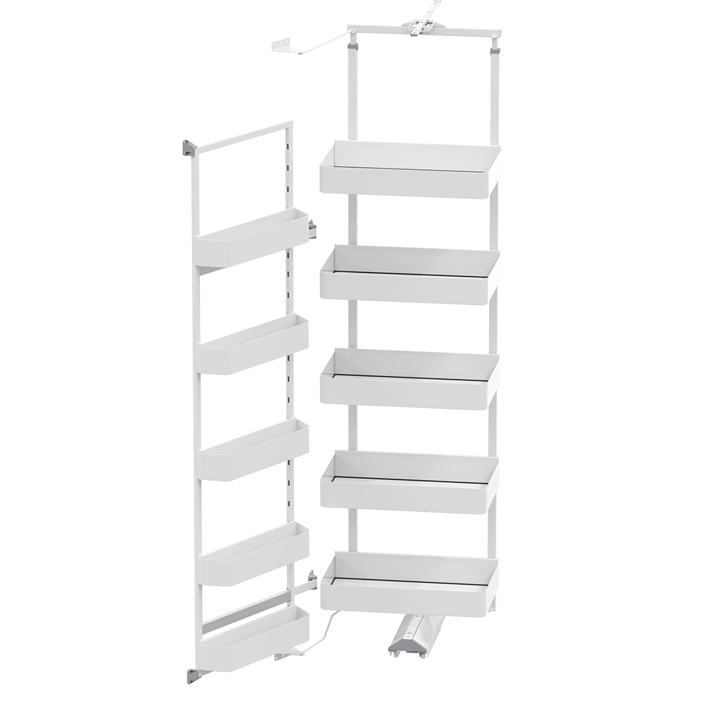 Komplett sett består av uttrekksramme, skinnesett med normaluttrekk og softclose, frontramme, 2 x 5 stk kurver Essentio med stålramme i hvit farge. Individuell høydejustering av hyllene.
